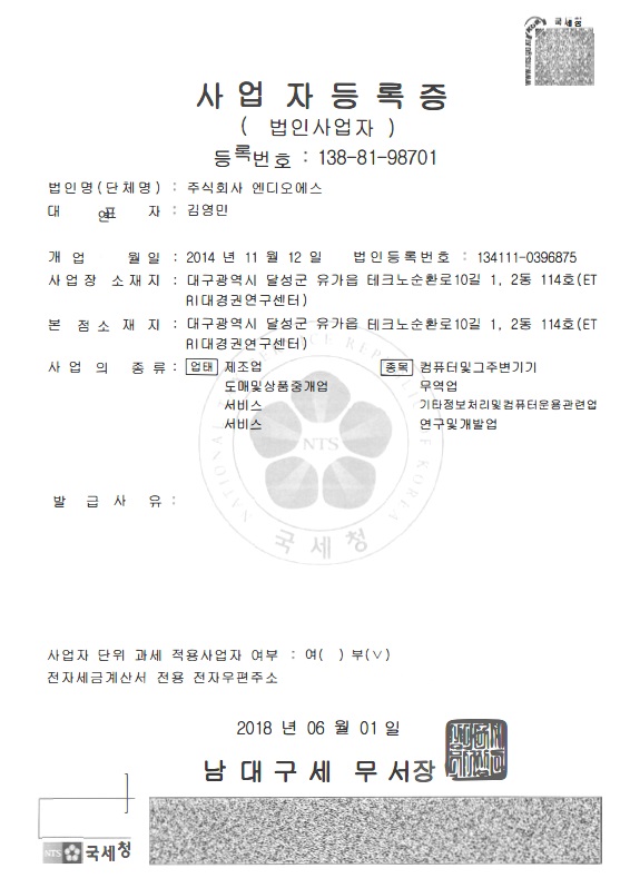 엔디오에스의 기술력을 증명할 수 있는 인증서입니다.